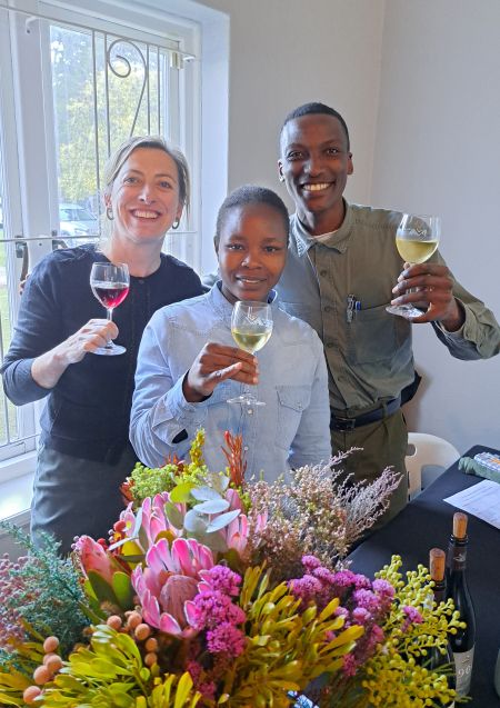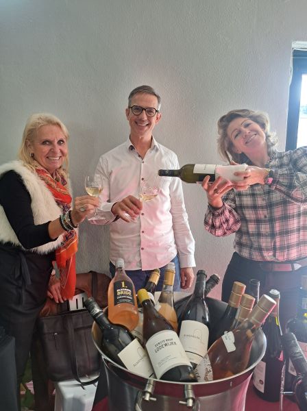 Sabine Fiorine van Eerste Hoop klink glasies met Joris en Natalie van Almenkerk van Almenkerk Wine Estate. (Foto: Clifford Roberts)