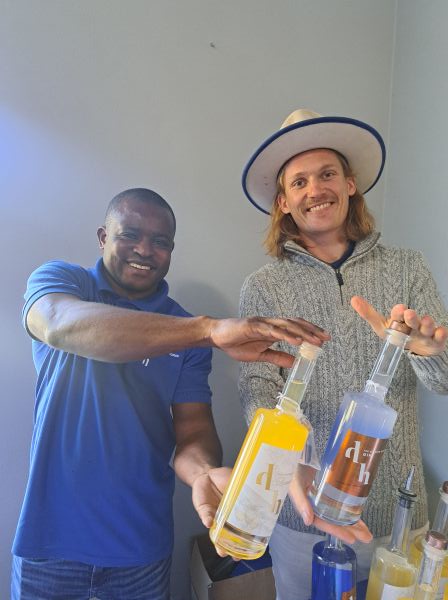 Tyler Nyasulu en Jelle Jacobs van The Drunken Horse Gin wys hul slag met mengeldrankies en hoe skeef hul produk se bottel nou eintlik is! (Foto: Clifford Roberts)