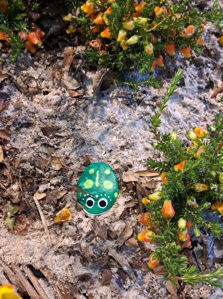 Ek het onlangs ’n klein klippie met ’n groen padda-ontwerp opgetel en besluit hy sal goed aard in die fynbos van Leon se uitstalling. Hy het daar langs die poeletjie neffens die luiperdspoortjies sy lêplek gekry.