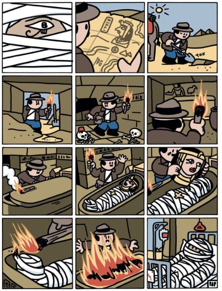 Op bladsy 103 moet ’n mens iets weet van Josephine Baker se piesangrompie om die groteske vermenging met King Kong se storie te verstaan. En sonder om veel te weet van Gene Kelly se Singing in the rain, sou die strokie op bladsy 104 veel minder sin maak. Moenie Julie Andrews se karakter uit The sound of music op die volgende bladsy mis nie! Wes Craven se Scream word ook verpletter op bladsy 106.