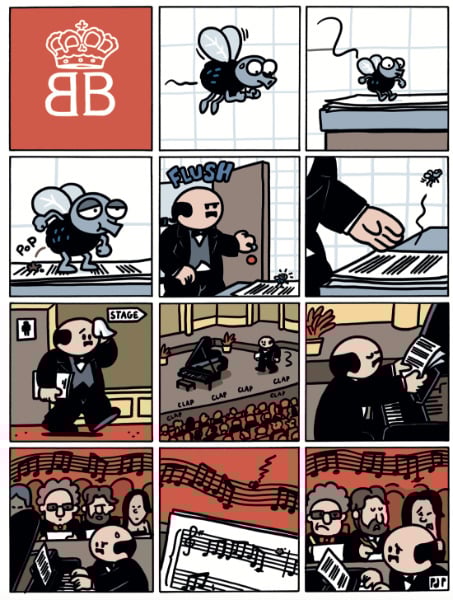 Die tweede strokie in die boek is ’n goeie voorbeeld. Boykie is die grootbaas van ’n groot maatskappy. Sy sekretaresse bring ’n oorhoofse projektor met ’n transparant. (Wie onthou hulle nog?) Die arme vrou plaas egter die transparant onderstebo, wat die wins na benede laat tuimel, volgens die grafiek. Boykie spring by die venster uit en val hom te pletter. Dan sien die sekretaresse die fout raak en plaas die transparant korrek neer. Die wins is fantasties, maar Boykie is dood.