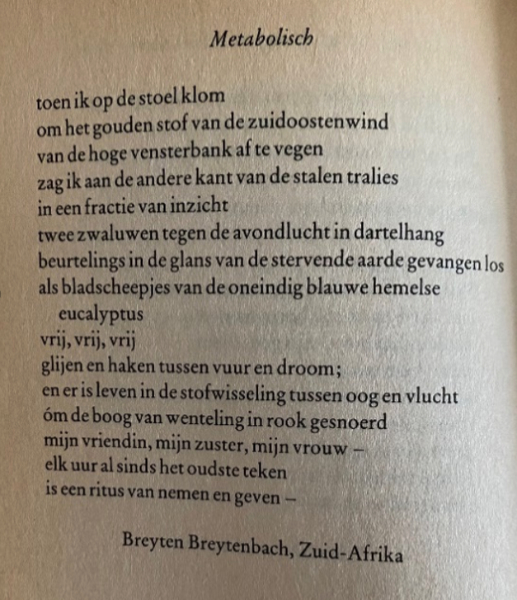 YT: Naast de expliciete maatschappijkritische poëzie zijn er de gedichten waarin de verbeelding van Afrika vorm krijgt, de vele liefdesgedichten, de lyriek waarin verval, verrotting en de dood bepalende motieven zijn, het nomadische Middenwereld-discours, de Zenboeddhistische gedichten. Is er een facet in Breytenbachs poëzie dat je met bijzondere belangstelling of affiniteit hebt gelezen?