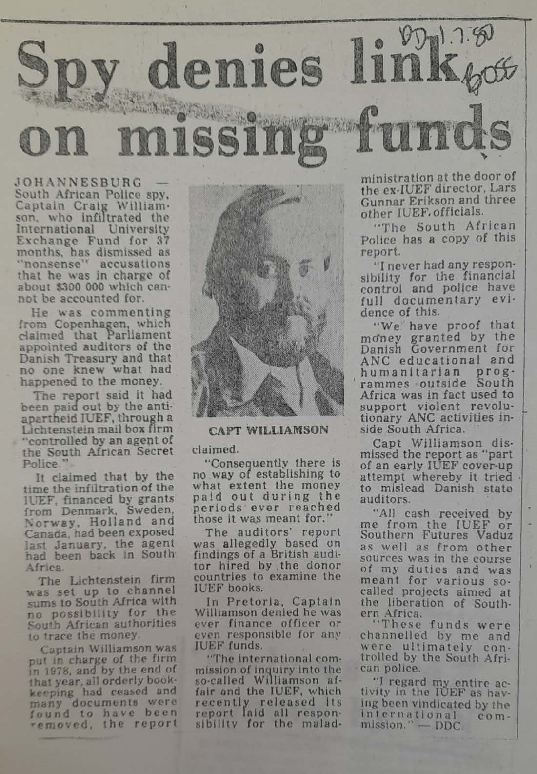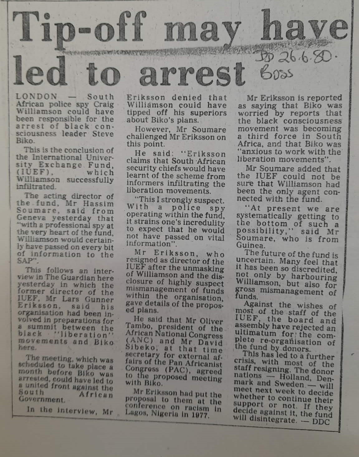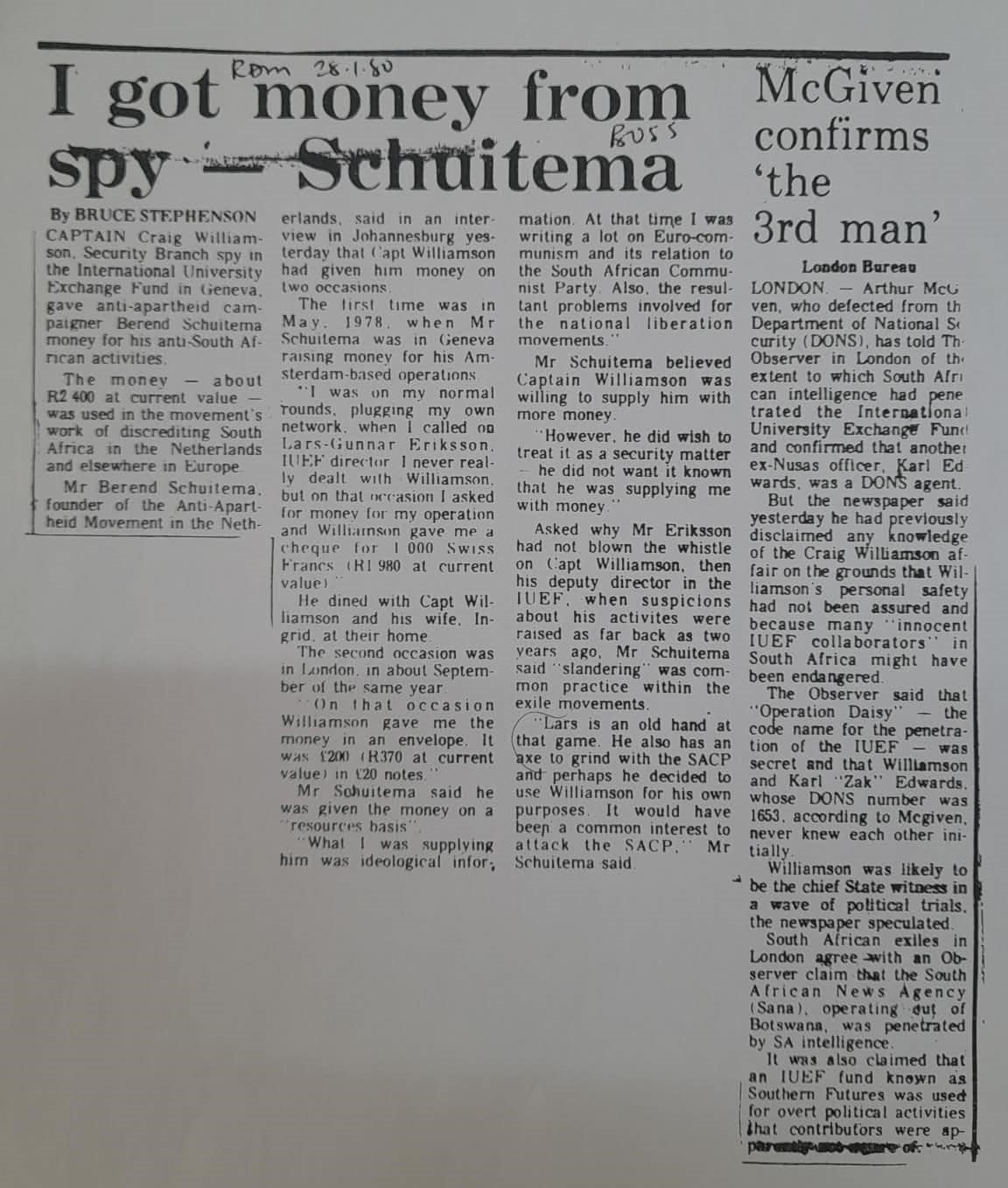 De rol van Williamson moet natuurlijk verder worden onderzocht. Her en der heb ik wat speurwerk kunnen verrichten, onder meer in krantenknipsels bewaard in de Alexandre Moumbaris Papers in het Historical Papers Research Archive van de Universiteit van die Witwatersrand. Moumbaris was de Grieks-Egyptische verzetsstrijder, lid van het ANC en veteraan van de militante organisatie Umkhonto we Siswe. Het dossier bevat onder meer mailcorrespondentie van/met Schuitema over Okhela en de banden met de Zuid-Afrikaanse Communistische Partij (SACP). De biografie van de journalist Jonathan Acer over Craig Williamson is revelerend voor de meedogenloze strategieën en de “mefistofelische” verschijning van de beruchte officier van de Zuid-Afrikaanse politie in de tijd van apartheid.