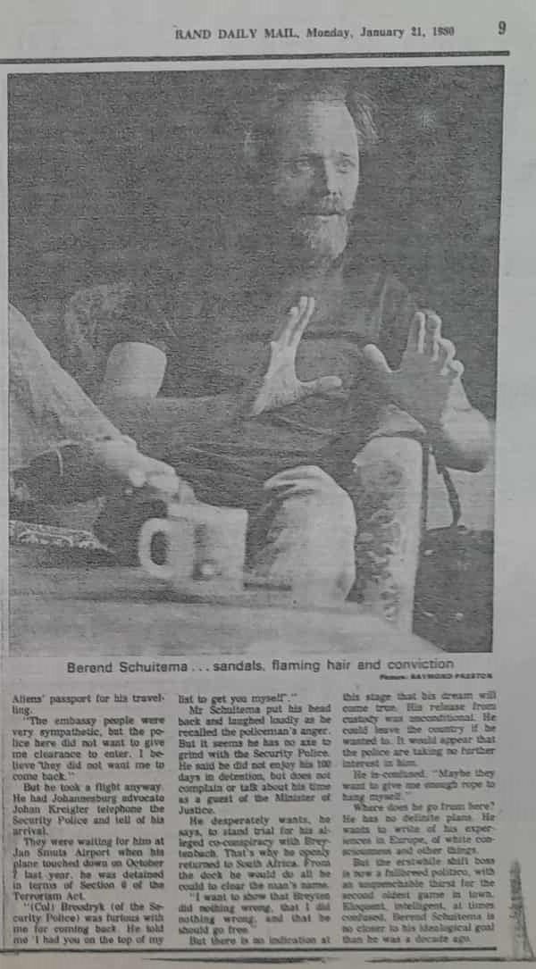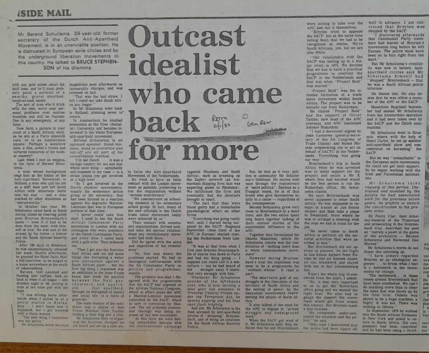 Het vermelde interview met Berend Schuitema, ‘The revolutionary who lived under a cloud of suspicion’ door Maggie Davey, verscheen in Sunday Times (29 januari 2023). Het citaat van Breytenbach in de titel van mijn bijdrage is ontleend aan dit artikel. Met dank aan Anthony Akerman voor het signalement. Dank aan Alwyn Roux voor de kritische lectuur.