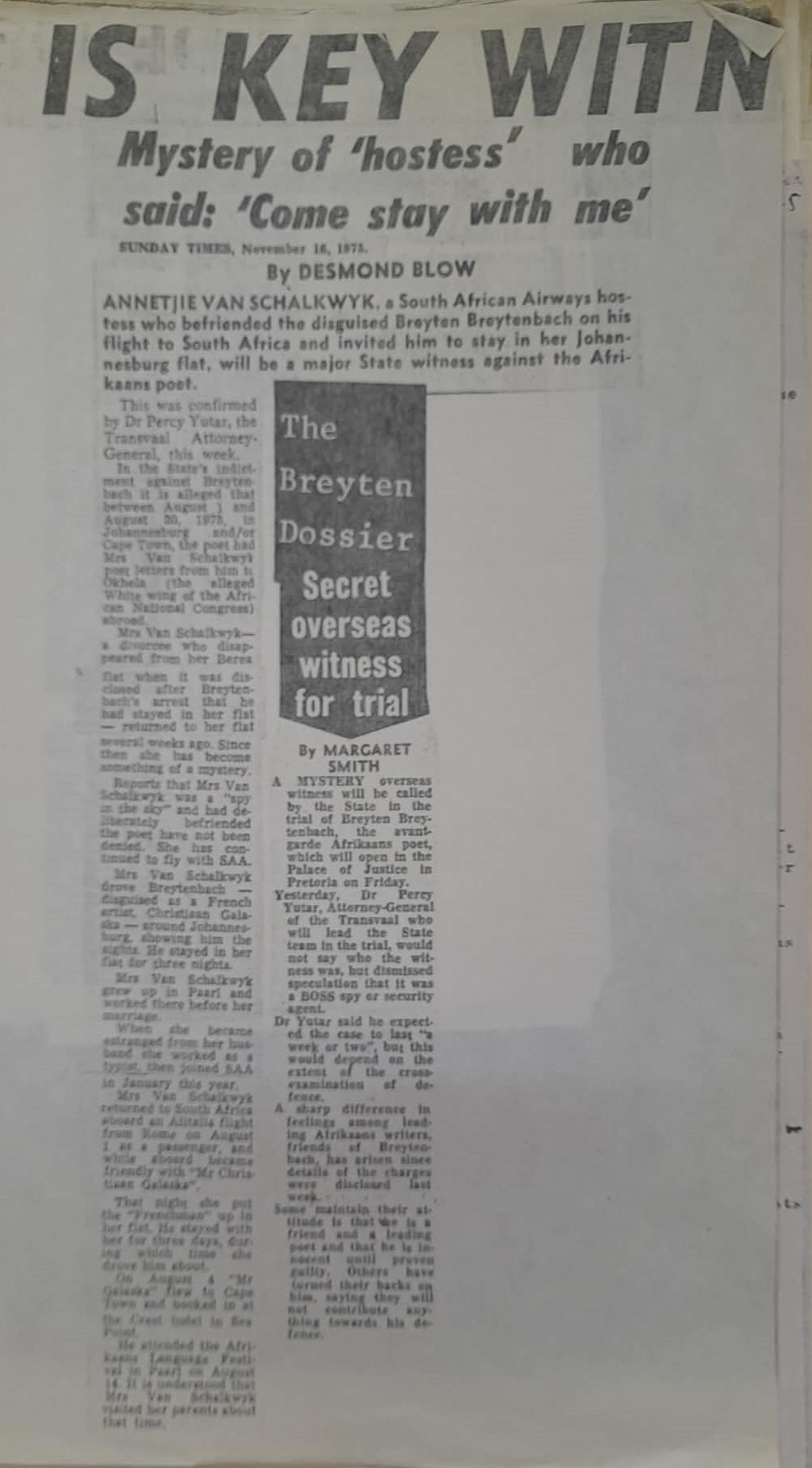 Dat hij tijdens de vliegreis naar Johannesburg dan nog eens openhartig sprak met Annetjie van Schalkwyk, stewardess van South African Airways en volgens Braam zonder meer een “sluiswachter” en dus een verklikker in dienst van het autocratische regime in Pretoria, heeft hem na een paar weken in Zuid-Afrika de das omgedaan. Op de luchthaven Jan Smuts is hij kort voor de geplande terugkeer naar Parijs aangehouden. Sunday Times berichtte in een paar artikels over de “lugwaardin” Van Schalkwyk, hoe zij informatie kon doorspelen aan de politie en hierdoor mee aan de basis lag van de achtervolging, nogal spannend beschreven door Jonathan Ancer in zijn biografie over Craig Williamson, en uiteindelijk de aanhouding van Breytenbach. Zij is volgens een Zuid-Afrikaanse krant (zie foto) verhoord als kroongetuige op het proces in het Gerechtshof van Pretoria. Breytenbach kreeg na een sterk gemediatiseerd en internationaal druk gevolgde rechtszaak een celstraf opgelegd van negen jaar, waarvan zeven jaar effectief. Over die rechtszaak schreef Jack Viviers (1978) kort na de feiten een grondig gedocumenteerd verslag.