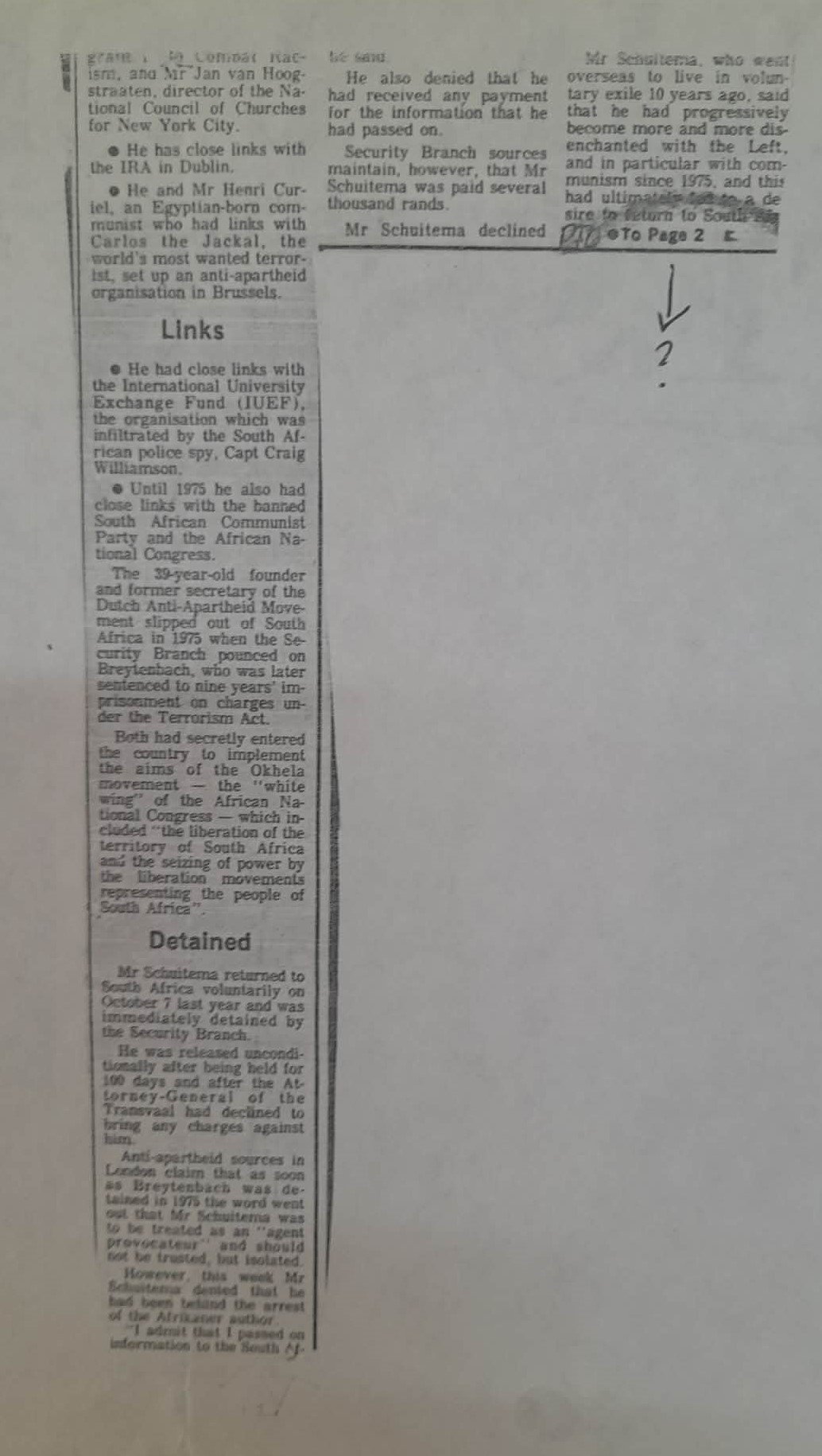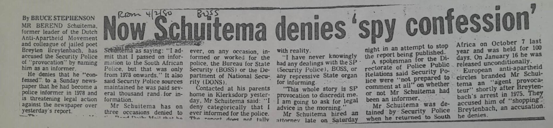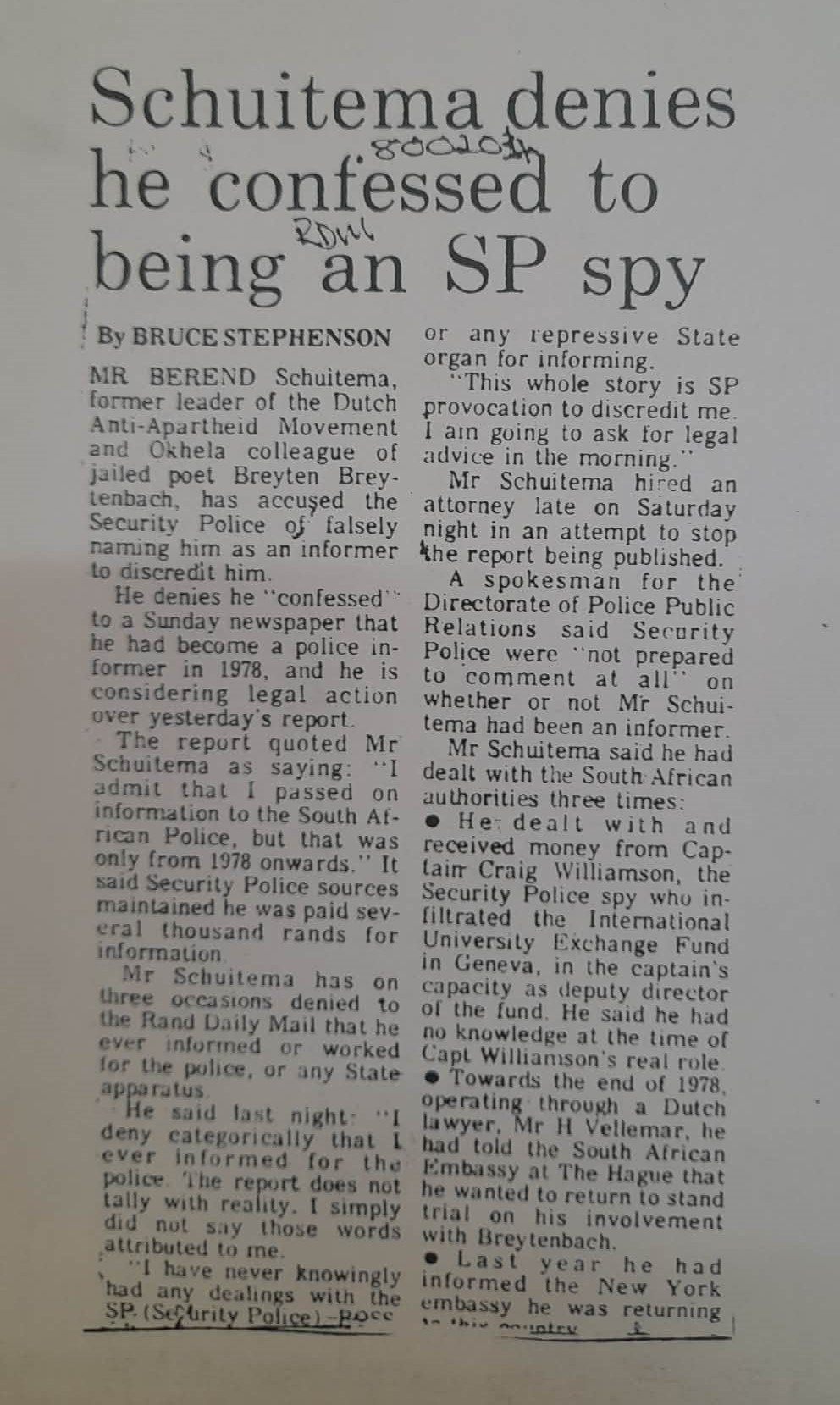 De beschuldiging klopte in ieder geval niet. De bewering was zoals ik het begrijp een kwaadwillige poging Schuitema bij kameraden in diskrediet te brengen. Schuitema gaf het ook zelf aan, zoals blijkt krantenberichten in de collectie Moumbaris, en ook in correspondenties, bijvoorbeeld in een lange persoonlijke mail van 8 juni 2000 door Schuitema gericht aan Alexandre Moumbaris. Breytenbach was er evenwel lang, eigenlijk tot kort voor het overlijden van Schuitema, rotsvast van overtuigd dat zijn landgenoot en medestichter van Okhela wel degelijk het verraad op zijn geweten had.