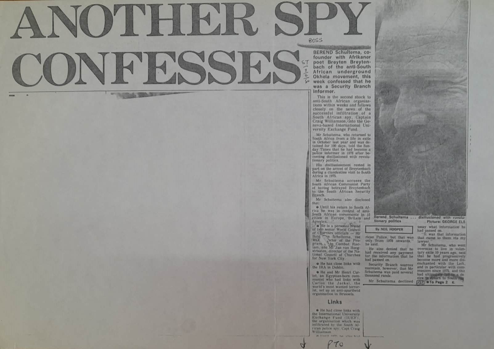 Interessant is de bewering van Conny Braam dat Williamson de verdenking van verraad, zo bepalend in de relatie tussen Breytenbach en Schuitema na 1982 en vernietigend voor het imago van Schuitema in Nederland, volstrekt op zijn geweten heeft. Zij spreekt over een “fabricage” of dus een malafide constructie: Williamson, die zich een strijder tegen het communisme en “secret agent” in opdracht van apartheid noemde, heeft Schuitema voor de buitenwacht afgeschilderd als een enige tijd bruikbaar agent die hij op een gegeven moment niet meer nodig had. Williamson liet doorschemeren dat Schuitema wel degelijk op de hoogte was dat hij meermaals is genoemd als politie-informant, dat rumours en verdenkingen de ronde deden. In Zuid-Afrikaanse media was in die tijd nogal wat commotie over een krantenbericht in The Boss Newspaper, waarin is gesteld dat Schuitema openlijk zou hebben toegegeven dat hij optrad als “Security Branch Informer”. Het was een tijd van achterdocht en verdraaiingen van feiten. Over het Afrikaanse krantenlandschap in Zuid-Afrika in 1975 noteerde Francis Galloway (1990: 173) dat het een “hoogtepunt van détente en ‘verligtheid’” beleefde, hoewel duidelijk ook spreekbuizen van de apartheidsstaat bijzonder actief waren.