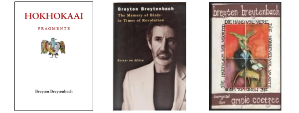 Breytenbach had veel van een ornitholoog. In tal van schilderijen en tekeningen duiken vogels op. Of op foto’s en door de schilder ontworpen boekomslagillustraties, zoals in de laatste tekst- en beeldbundel Hokhokaai. Fragmente (2021). Ook in de lyriek en in bespiegelende teksten zijn er vogels, zelfs in een vaak gebruikt heteroniem: ‘Woordfoël’ (een contaminatie van ‘fool’ en ‘vogel’). Beschouwende prozabundels kregen titels zoals Notes of Bird (1984) en The Memory of Birds in Times of Revolution (1996, vertaald als Denkend vuur). Een spraakmakende bloemlezing van Breytenbachs werk die Ampie Coetzee in 1995 samenstelde, is getiteld Die hand vol vere (1995). Op wel méér boekomslagen prijken reproducties van schilderijen met bizarre antropomorfe vogelfiguren. In Kouevuur (1969), bijvoorbeeld, wordt het vliegtuig dat het ik over Afrika naar het Zuiderkruis brengt als “die metaalvoël” aangeduid. Een paar regels verder is sprake van “die voëls van my taal”. Vogels worden onder meer geassocieerd met het zwerversbestaan, de persona van de outsider en de vagebond. Altijd onderweg, nergens ergens. Ze dragen in zich méér connotaties, zoals beklemming, dood en verval.
