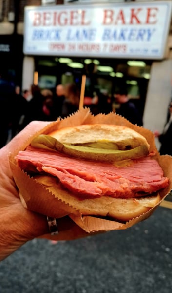 Buite op die hoek van Brick Lane en Bethnal Green Street staan en eet ek my bagel in die Londense Januarie-koue. Met elke hap proe ek bagel, soutbeesvleis, agurkies, mostert en die geskiedenis van Brick Lane en Londen.