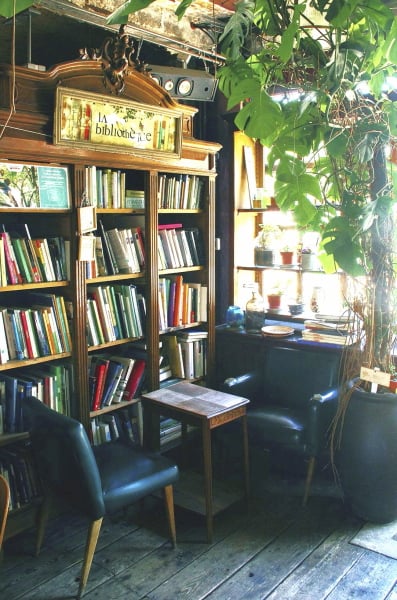Daar is ’n klein hoekie met boeke wat fokus op ekologie, selfdoenprojekte en volhoubaarheid. Dit is die ideale plek om met ’n koppie tee weg te sak en nuwe idees vir jou eie huis te kry. Die Wi-Fi is ook gratis en ek soek vinnig ’n paar stories op oor hierdie betowerende plek.