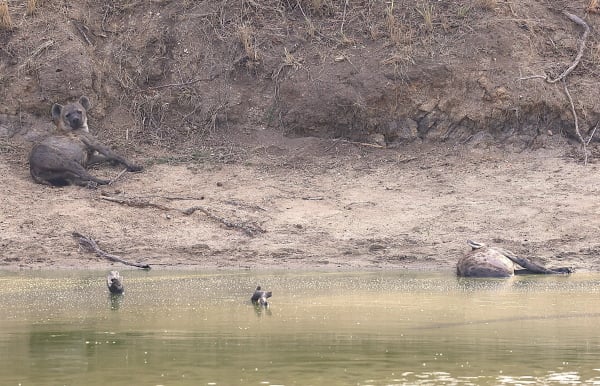 By ’n damwal sit ons die enjin af. Twee hiënas lê in die dam se vlakwater om af te koel. Een drink gulsig water; die goue druppels rol teen sy nek af in die laatmiddagson. Skielik is die vreesaanjaende dier ’n kunswerk.