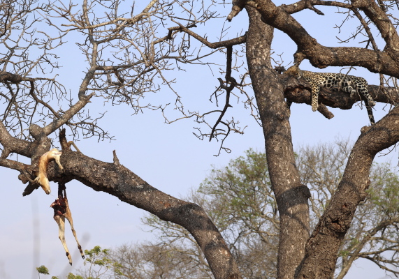 ’n Luiperd lê in ’n maroelaboom met ’n halfgevrete impala; een toontjie haak aan ’n takkie. ’n Stukkie gras hang nog uit die impala se bek. ’n Hiëna wag geduldig onder. Die oggend is oortrokke; elke geluid is harder in die bos, maar dis doodstil hier waar ons in verwondering sit – uitverkore tot ’n magiese oomblik.