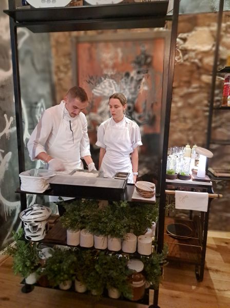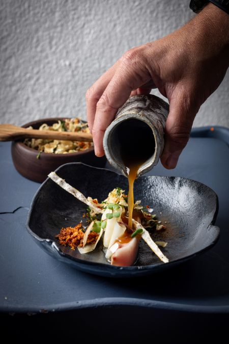 Elke dis word in handgemaakte keramiekware bedien, Lady Salsify is op die eetgerei uitgekerf en elke wyn kry sy eie kultivar-spesifieke Riedelglas. Dié glasmaker se passie om die wyn op sy beste te laat smaak neem beslis hande met die passie van die sjefspan.