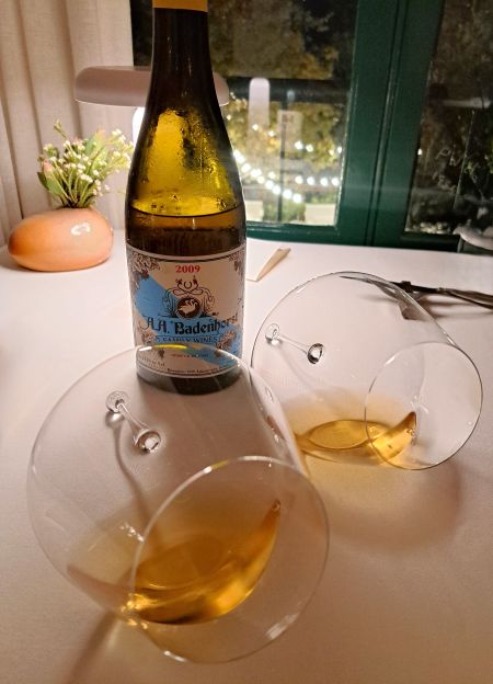 Die Zalto Gravitas Omega-glas het geen voetstuk nie en rus op sy sy om die mooi kleur van die wyn teen die wit tafeldoek te vertoon. Die groot rondings van die glas gee ook die wyn kans om asem te haal. Ons het die AA Badenhorst White 2009 daarin geniet.