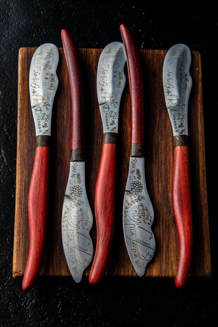 Elke bottermessie is handgegraveer en bring hulde aan Lady Salsify.