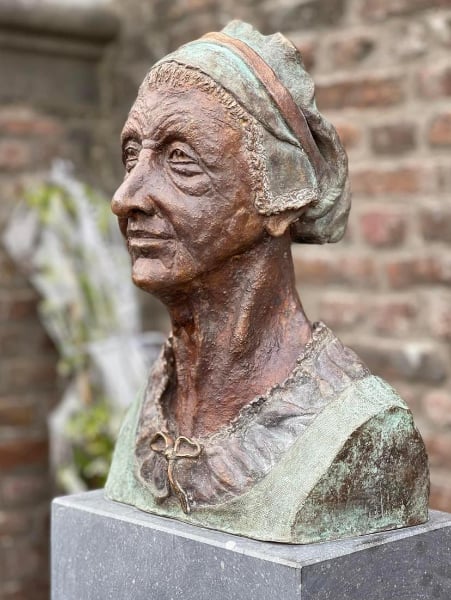Portret van Entgen Luyten (1600-1674), by die Limbricht-kasteel. Dit is ’n geskenk van (die familie van) afstammelinge van Entgen Luyten. Die beeldhouwerk is deur Ankie Vrolings (Foto deur Mathje1963, via WikiMedia CC BY-SA 4.0)