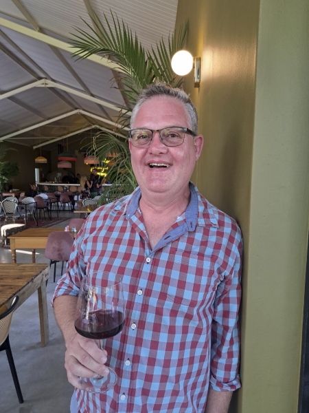 Friedrich skink van sy yskoue salmpienk Rosé 2024 en Wellington (of Hellington soos hy dit noem) se hitte is gou vergete. Friedrich het lekker tapasstyl-eetgoed bestel om elkeen van sy handgemaakte wyne te komplementeer.