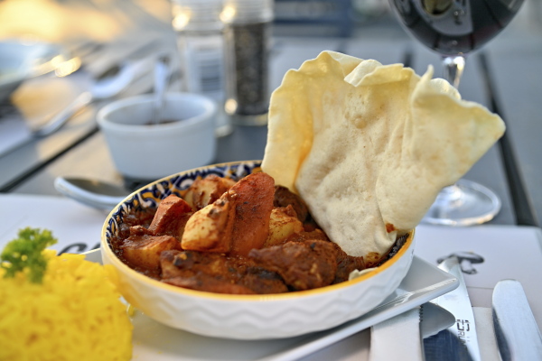 Ons geniet hierdie keer die lekker rooiversnit, Val du Charron Theatre of Wine Erasmus Den Deen, saam met murgsagte beeshaas, peri-peri-garnale en handgesnyde aartappelwiggies.