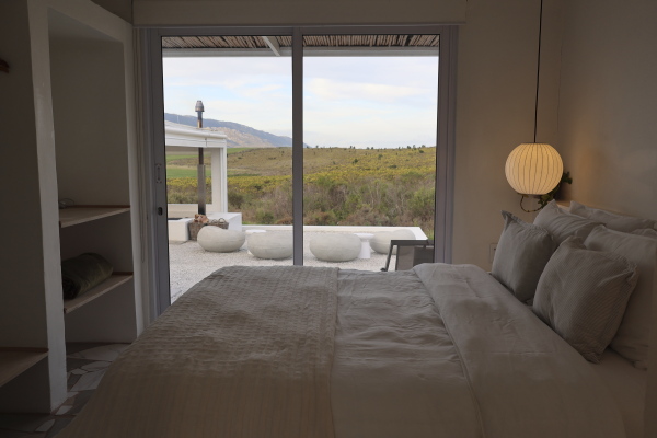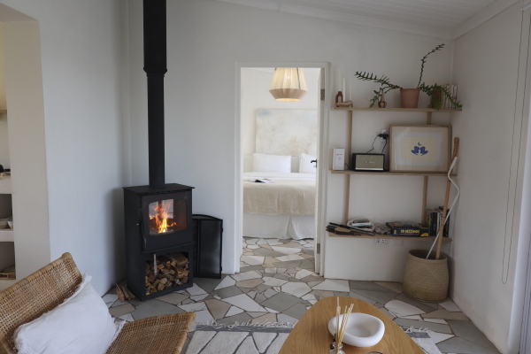 Ek het heel toevallig op sosiale media die kort video oor die verblyf gesien; alles aards, in skakerings van room en hout, grasmandjies, kerslig en kaggelgloed. ’n Warm swembadjie en pizzaoond buite; die lusernlande, fynbos en watervalle die enigste skilderdoek om te geniet.