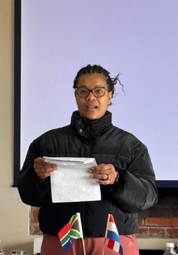 Een week na de Winterschool is de Namibische Paula Kaula, studente bij UNAM en docente Duits, Engels en Afrikaans op een middelbare school, nog steeds opgetogen. “Toen vorig jaar de SAVN conferentie naar Windhoek kwam, dacht ik, daar wil ik bij zijn. Ik heb toen als student-assistent meegeholpen en wie had gedacht dat dit daaruit zou voortvloeien.” Het meedoen aan de Winterschool en aan de Taalwedstrijd alleen al was fijn en dat ze nu ook nog wint, voelt als een zegen. “Ik had dit nooit verwacht en ben erg trots op mezelf. Om de Winterschool bij te wonen was al een voorrecht, en nu ook nog die betoogwedstrijd winnen.” Aanvankelijk wilde ze niet meedoen, maar bedacht zich en besloot de uitdaging aan te gaan. Ze kijkt ernaar uit om naar Nederland te gaan, voor de internationale competitie, maar, “Ik voel me nu al een winnaar. Mijn collega’s zijn ook heel enthousiast en er zijn reeds plannen om meer Nederlandse taal op te nemen Ik ben de eerste vertegenwoordiger uit Namibië, en dit zal zeker meer interesse bewerkstelligen voor de Nederlandse taal in mijn land.”