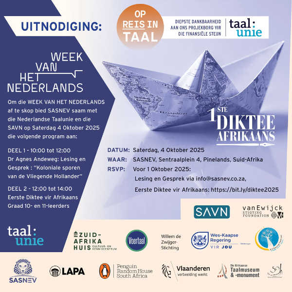 Namens die Suid-Afrikaanse Vereniging vir Neerlandistiek (SAVN), in samewerking met SASNEV, word die lede genooi na ’n spesiale geleentheid wat hierdie jaar ter viering van die Week van het Nederlands plaasvind.