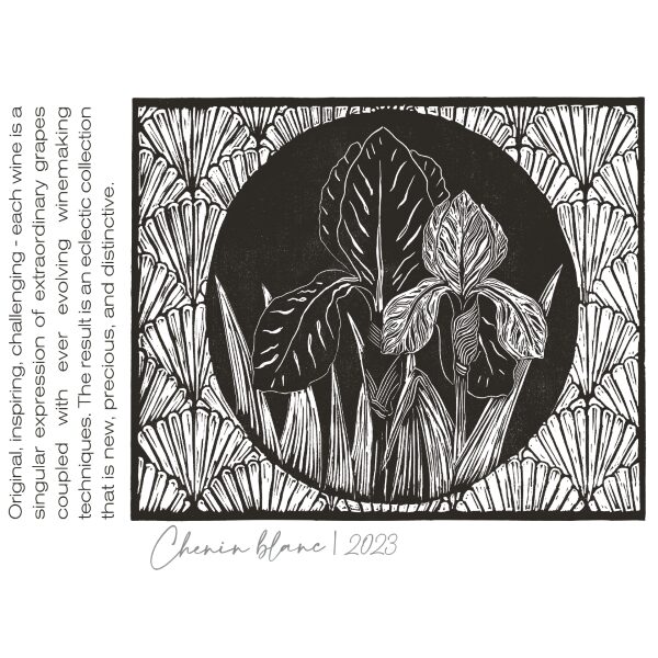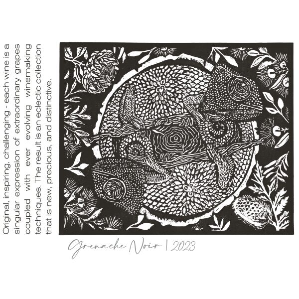 Liezl het die etiket vir die Grenache Noir 2023 gemaak en vertel dis ’n volronde rooiwyn waar grasie en presisie met donkervrug-intensiteit saamvloei. Druiwe van Piekenierskloof (80%) en Darling (20%) is met veroudering in ’n kombinasie van klei-amforas en ou eikevate gebruik. Die wyn betower met ’n digte blomparfuum en geure van rooi korente, pruim en ryp vye, met ’n subtiele tikkie spesery en fynbos op die nasmaak.