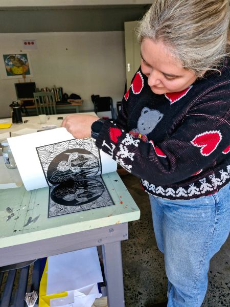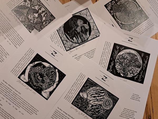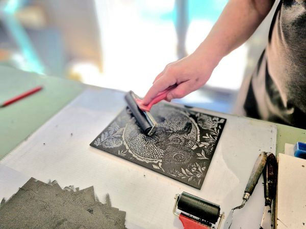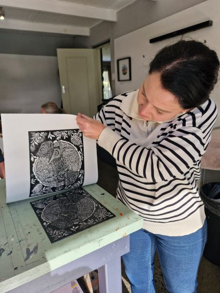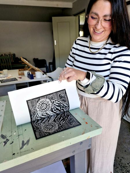 Die linosnee waarvan die etikette vir die Chenin Blanc 2023 gedruk is.