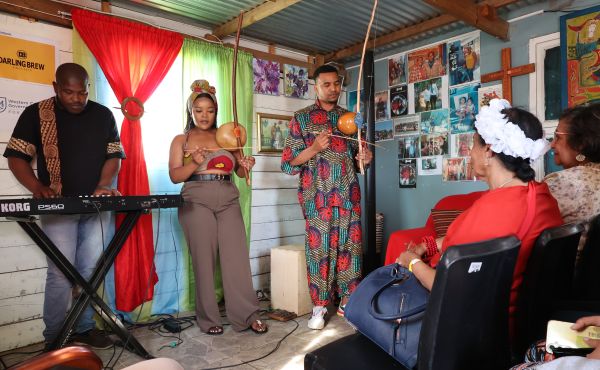 Frits van Ryneveld, mede-eienaar van die Perron en Darling Sweet, wie se proelokaal ook hier is, verwelkom ons en vertel dat Pieter-Dirk Uys hier sou optree, maar 09:00 die vorige oggend – twee uur voor die eerste vertoning – moes kanselleer weens laringitis. Met wonderwerke aan die orde van die dag, het die Marimba All Stars van Langa sy plek gevul. “Die een oomblik was hierdie vier ouens nog in die bed op ’n Saterdagoggend, en die volgende oomblik het hulle hul eerste vertoning by die Voorkamerfees!”