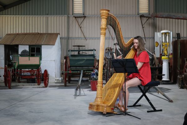 Jessica King met haar 100 jaar oue harp in die waenhuis van die Darling Museum.