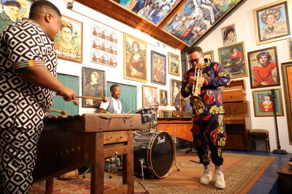 Kim Masala, tenoor en marimba; Skhumbuzo Mhlauli op dromme; en Thando Sishuba op trompet van die Marimba All Stars.