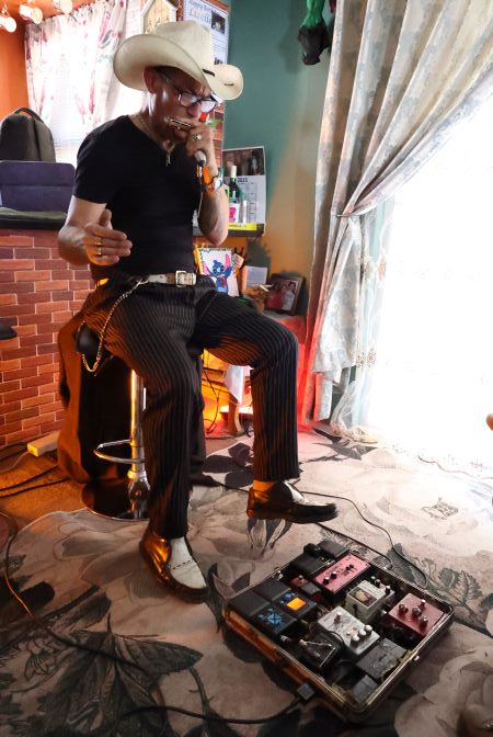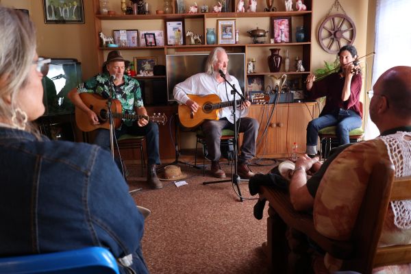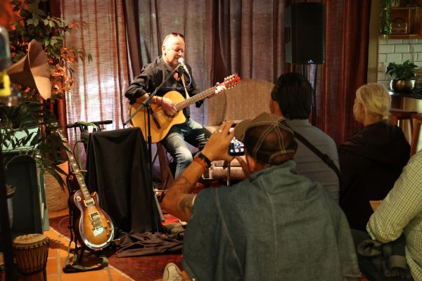 Daarna skuif ons aan na Glyn Lewis se huis in Hillstraat, wat vorige jare as gasheer vir ander kunstenaars opgetree het, maar vanjaar in sy eie voorkamer kan sing en kitaar speel. Sy vertoning is getiteld Video killed the radio star. Glyn sê hy hou van ouer musiek, want die lirieke het stories vertel van mense se lewens. Die nuwe generasie-musiek is net klanke en hol woorde. “Ons moet aanhou om die ou liedjies te sing, anders gaan die stories dood.”
